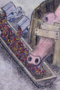 [Bildunterschrift: Ein Labyrinth von AbhangigkeitenDer intensive Landbau, der sich "konventionell" nennen läßt, wird von Abhängigkeiten gebeutelt. Mehr Ertrag (Mitte) wird durch Einsatz von Bioziden, Industriedünger und Maschinen (links) erkauft. Das führt zur Zunahme von Monokulturen und zum Verschwinden von Feuchtgebieten und Feldgehölzen (rechts). Agrochemie, Dünger und Maschinen kosten Geld, ebenso das Trockenlegen von Feuchtgebieten und die Einebnung der Landschaft. Höhere Kosten (oben) müssen durch höhere Erträge aufgefangen werden, die wiederum durch mehr Herbizide, Fungizide und Insektizide sowie durch Erschließung neuer Gebiete für den Ackerbau erkauft werden. Die Folge: das natürliche Kreislaufsystem geht zu Bruch (unten).] [36] Obwohl Vieh unter Energiegewinn für Menschen unverdauliche Pflanzen in Fleisch und Milch umwandeln kann, ist es als Verwerter von Edelfutter wie Getreide denkbar ungeeignet: Jede Energieeinheit im Rindfleisch muß mit rund zehn Weizenenergieeinheiten teuer erkauft werden. Bei der Erzeugung von Hühnerfleisch ist die Relation zwischen Aufwand und Nutzen sogar nur zwolf zu eins; elf von zwolf verfütterten Getreidekalorien gehen verloren. Ebenfalls von mangelhafter Energieausnutzung zeugt das Verhaltnis zwischen investierter und produzierter Energie bei der Produktion von Mi1ch (5:1), Eiern (4:1) und Schweinefleisch (3:1). Von Extremfallen einmal abgesehen - industrieller Rinderintensivmast, bei der rund 80 Kalorien Fremdenergie für eine einzige Fleischkalorie verpulvert werden - kostet eine Kalorie tierische Nahrung im Durchschnitt sieben Getreidekalorien fossilen Ursprungs. Wird aus dem Getreide Brot gebacken, beträgt das Verhaltnis 1:1. Anders ausgedrückt: Von dem Getreide, das in Form von Brot 100 Menschen ernähren würde, konnen auf dem verlustreichen Umweg über Hühnerfleisch nur acht Menschen leben. Trotzdem geht die ungeheure Verschwendung in den großen "Veredelungsbetrieben" - wo eigentlich nur der Kontostand des Besitzers "veredelt" wird - munter weiter: Im Wirtschaftsjahr 1979/80 wurden in der Bundesrepublik 26,4 Millionen Tonnen Getreide verbraucht. 16,5 Millionen Tonnen (62,5 Prozent) wanderten in Viehtröge. ln den USA sind es sogar knapp 90 Prozent, in den Entwicklungsländern dagegen nur zehn Prozent. 6,5 Millionen Tonnen entsprechen drei Vierteln der Inlandsgetreideproduktion von 23 Millionen Tonnen. Ein Vergleich: Als deutscher Beitrag zum Intemationalen Nahrungsmittelhilfeabkommen wurden 1979 147 800 Tonnen Getreide unentgeltlich in Entwicklungsländer geliefert - knapp 0,9 Prozent der ans Vieh verfütterten Menge. Soja und Getreide: Perlen vor die SaueZur Sättigung der unterernährten Menschen, von denen es Hunderte von Millionen gibt, trugen diese Almosen der Wohlstandsbürger nicht bei. Ganz im Gegenteil: Die Verschwendungsorgie der Wohlstandsbürger bedarf zu ihrem Gelingen großer Mengen von Grundnahrungsmitteln aus Ländern der Dritten Welt. Die Freßlust der einen verschlimmert den Hunger der anderen. Mit dem importierten Viehfutter, das in der Europaischen Gemeinschaft und auch anderswo teilweise lastige Überschüsse erzeugen hilft, könnten Millionen Afrikaner, Asiaten und Lateinamerikaner vor dem qualvollen Hungertod bewahrt werden.