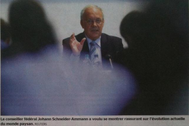 Difficile exercice (l'équilibrisme pour le conseiller fédéral Johann Schneider-Ammann. En marge de la présentation du rapport agricole 2013, hier, à Zollikofen (BE), il a voulu se montrer rassurant sur l'évolution actuelle du monde paysan. «Les conditions-cadres fixées dans la politique agricole 2014-2017 sont claires et bonnes. Elles forment les bases d’une agriculture productrice qui prend soin des ressources naturelles.» Sitôt les deux mots-clés du moment dits - production et écologie - le ministre s’est alors penché sur l’avenir en d’autres termes: «L'agriculture suisse devra devenir plus compétitive. Elle doit avoir accès aux grands marchés. C’est une chance pour nous.»