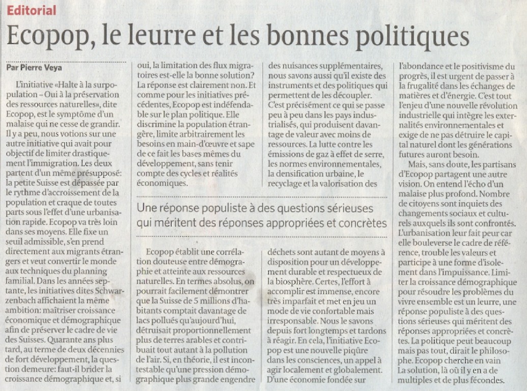 Certes, l'effort à accomplir est immense, encore très imparfait et met en jeu un mode de vie confortable mais irresponsable. Nous le savons, depuis fort longtemps et tardons à réagir. En cela, l'initiative Ecopop est une nouvelle piqûre dans les consciences, un appel à agir localement et globalement. D'une économie fondée sur l'abondance et le positivisme du progrès, il est urgent de passer à la frugalité dans les échanges de matières et d'énergie. C'est tout l'enjeu d'une nouvelle révolution industrielle qui intègre les externalités environnementales et exige de ne pas détruire le capital naturel dont les générations futures auront besoin.