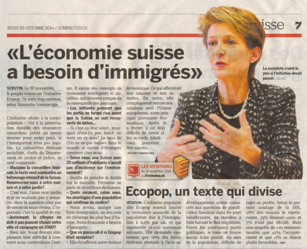 Et comme pour les initiatives précédentes, Ecopop est indéfendable sur le plan politique. Elle discrimine la population étrangère, limite arbitrairement les besoins en main-d'œuvre et sape de ce fait les bases mêmes du développement, sans tenir compte des cycles et réalités économiques.