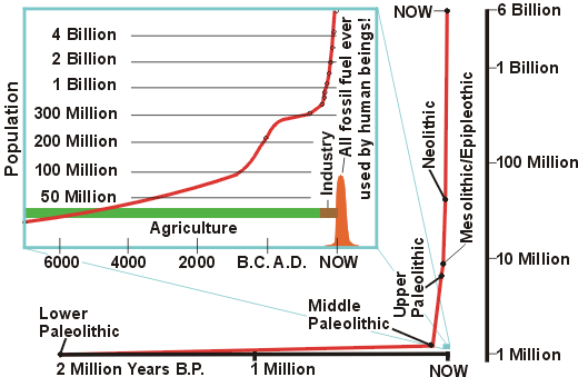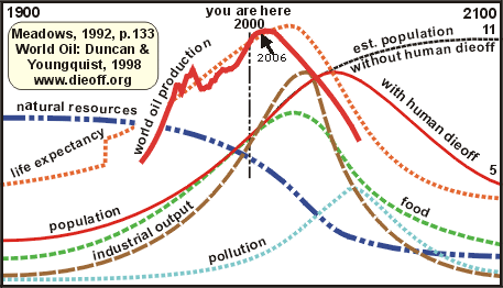 The outer graph shows the development over a period of 2 million years. The smaller graph in the blue frame shows the development since the beginnings of agriculture, some 240 generations ago. Humans with our potential and posture have existed since at least 100,000 years, which is 4,000 generations of 25 years each. Modern time with our explosion of populations and resource consumption started around 1750, that is 10 generations ago. Present world population size is 6.5 billion (2006) - and growing at a rate of 80 million a year. Compare facing the future with on-line population counters. Resource consumption and depletion is growing relatively faster than population growth because of economic growth. ![]() The open question is which key resource will be depleted first and will then lead to a collapse of the present structures. A grim future lies ahead. Unless we decide to halt growth and convert back to a low resource use society. We will count ourselves lucky if full-scale resource wars can be avoided. The below graph shows the development - past and possible future - from 1900 to 2100. ![]() The utimate scenario could well be - but God forbid! - the flooding scenes as pictured here ... albeit not limited to the blacks or colored people. We believe climate change will also hit the white-collared whites. The above graphs and perspectives raise important questions, which must be answered. You find some important questions here. Also see scenarios and about ecoglobe. |