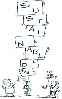 Introduction | ecostory | Opinion | Links Sustainability means that a given societal structure and mode of functioning can be maintained UNCHANGED for a very long time, say many hundreds of years. (compare: greenfacts) Sustainability is NOT "sustainable development" ("SD"), which is frequently being referred to as "... forms of progress that meet the needs of the present without compromising the ability of future generations to meet their needs (e.g. WBCSD", in line with the Brundtland definition of 1982. "Sustainable Development" is a dangerous fiction, born out of an honest desire to promote sustainability, but misguided and deluded by economic theories that lack understanding of hardcore physical realities. In fact, NO development can be sustained for a long time since every development means an increase in consumption of material resources. And, as most non-scholars recognise, material resources ARE finite. Surfing the web (April 2004) we find this "Brundtland principle" being repeated ad nauseam (Named after the World Commission on Environment and Development (known as the "Brundtland Commission") who in 1987 presented a special report to the UN called "Our Common Future". One should note, however, that their footprint refers to the BIOLOGICAL footprint only. Therefore they can speak of the number of Earths that would be needed to support humanity's present consumption of renewable biological resources. Intuitively, one will think that our human footprint represents our total weight, not only our biomass but also our clothes, glasses, watch, belt, mobile phone, as well as our share of the house, the school, the car, the infrastructure and all that makes up for our standard of living. ecoglobe believes that that is the reality. Our footprint is everything we use and consume, including the non-renewable resources. So here we are by no means talking of numbers of Earths we would need. Because even 100 Earths would not refute the hard fact that most natural resources are NON-RENEWABLE. Therefore, since we do have only one planet and no other planet is in sight, we must reduce our resource consumption before we run out of them. Opinion | ecostory | [Introduction] | Links ecostory | links | introduction | Opinion Links | ecostory | introduction | Opinion |